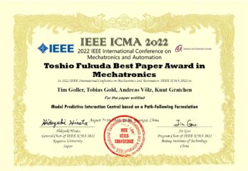 At the IEEE International Conference on Mechatronics and Automation 2022 (ICMA), our colleague Tim Goller received the Toshio Fukuda Best Paper Award in Mechatronics for his paper “Model Predictive Interaction Control based on a Path-Following Formulation”. Congratulations to Tim!