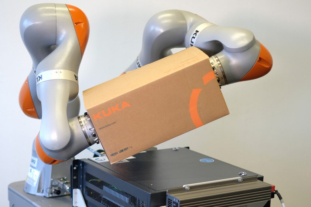 Dual-armrobots offer a high potential for automation technology, as they canbe used to implement tasks that are not possible with one arm alone.This includes in particular the manipulation of large or heavyobjects that exceed the payload of a single arm. Illustrativeexamples are the movement of beverage crates, long boards or pipes,which are also preferably grasped by humans with both hands.